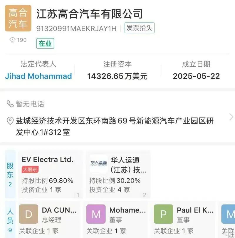 5月22日,我们从天眼查看到,华人运通与EV Electra合资成立江苏高合汽车有限公司,华人运通江苏持股30.2%,EV Electra持股69.8%。江苏高合汽车有限公司的经营范围包括道路机动车辆生产、汽车零部件研发、工程和技术研究和试验发展等。